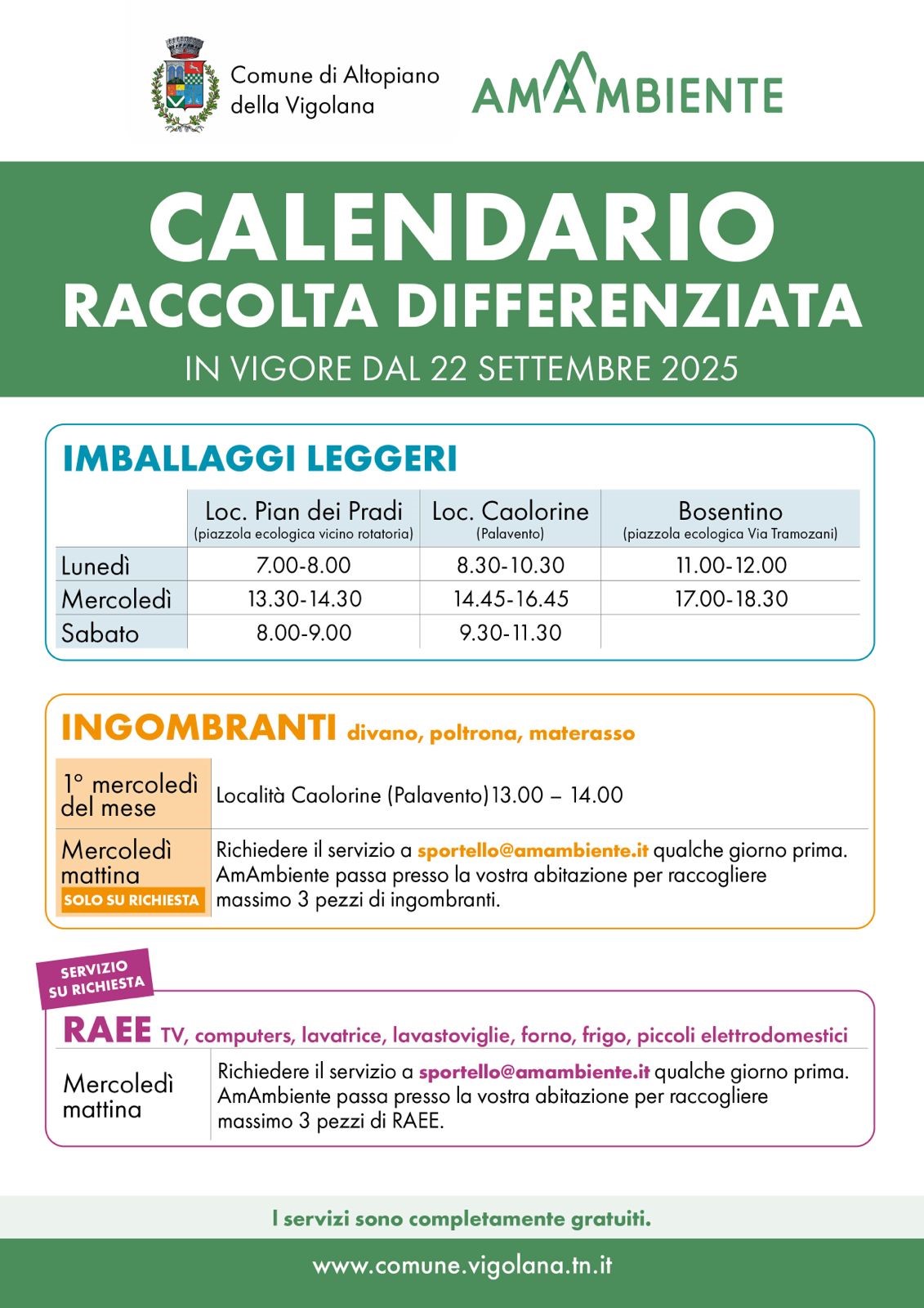 A partire da lunedì 22 settembre cambia il calendario per imballaggi leggeri ed ingombrati