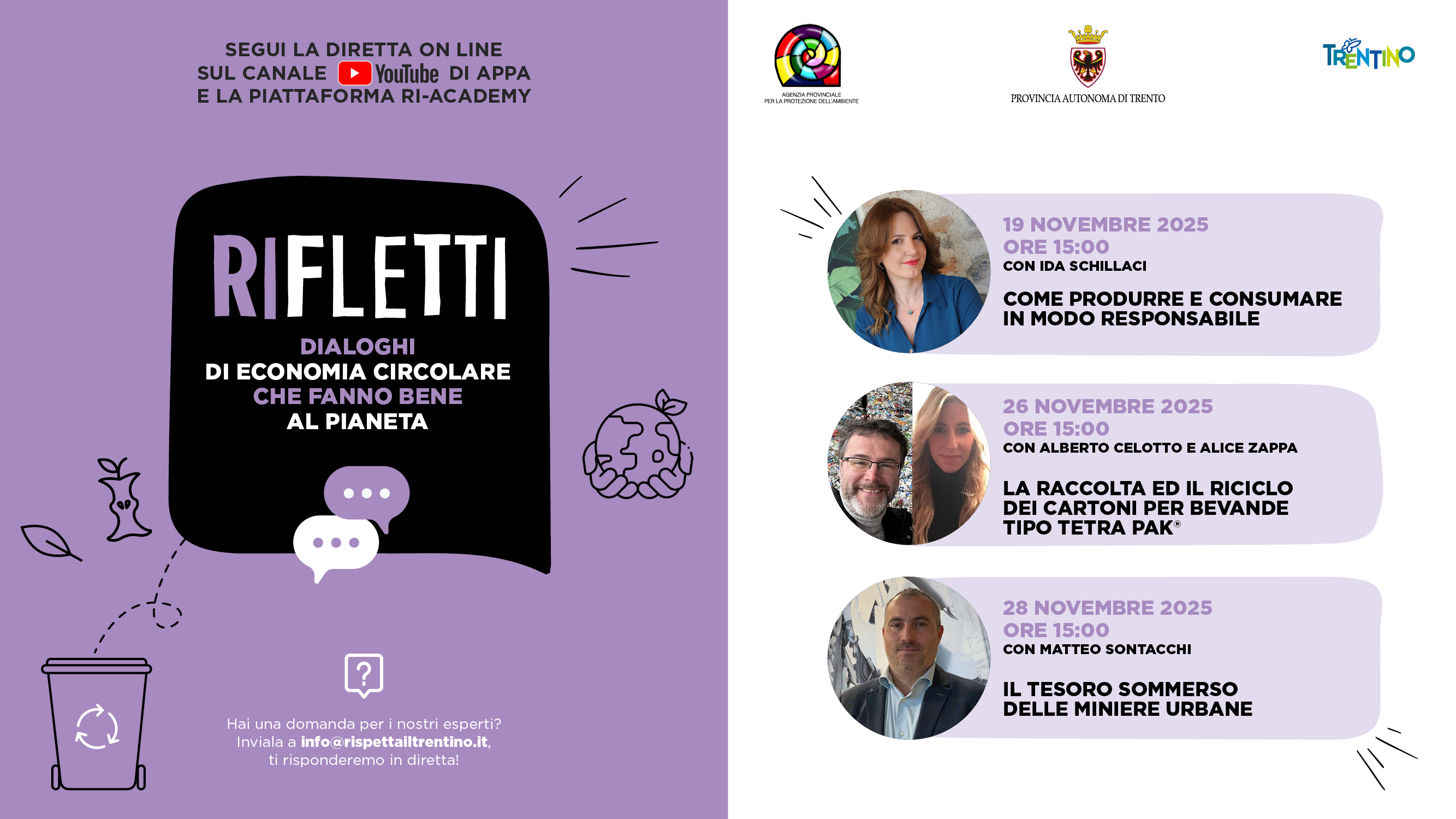 TRENTO, 4 novembre 2025 – La Provincia autonoma di Trento e l’Agenzia provinciale per la protezione dell’ambiente (APPA), nell’ambito della campagna “Rispetta il Trentino”, sono liete di presentare “RI-FLETTI: Dialoghi di economia circolare che fanno bene al pianeta”.
