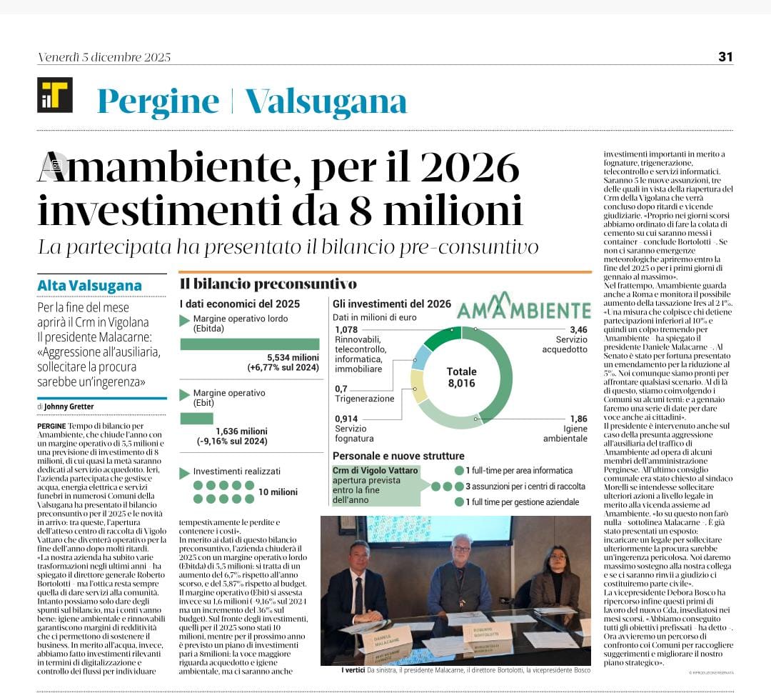 Il Dolomiti - Venerdì 5 Dicembre 2025 - Un anno positivo per AmAmbiente: "Confronto con i Comuni per migliorare". Sulla vicenda dell'ausiliaria: "Ci costituiremo parte